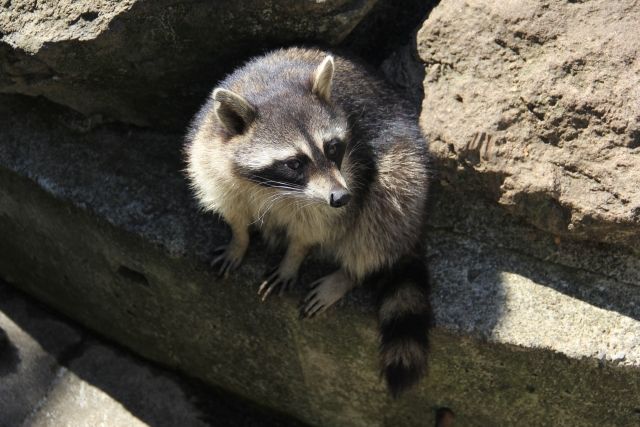 アライグマの最大の特徴はしっぽのシマ模様です。また、4種類のなかで1番灰色が強くでています。足先は黒いことがほとんどですが、脚自体は白色の個体が多いです。