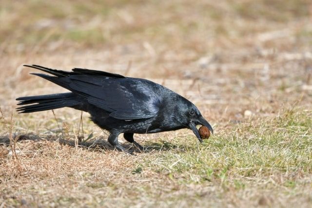 カラスの種類によっては、空高くから硬い地面へクルミを落として、その勢いで割るという種類もいます。