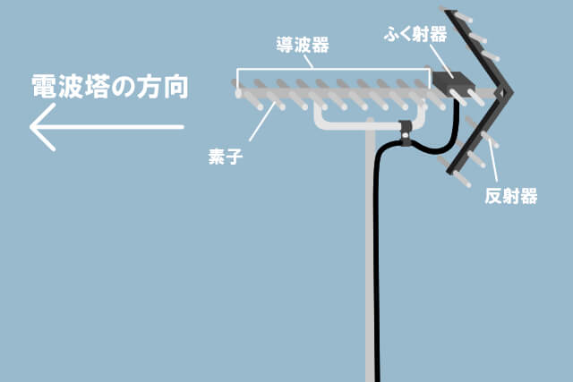 八木式アンテナが同じ方向を向いている理由は、導波器を電波塔に向けて設置しているからです。