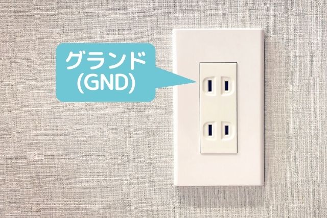 最も身近なグランド(GND)の例が、コンセントです。住宅のコンセントをよく見ると、2本並んでいる穴のうち左側が少しだけ長いのがわかります。この左側の穴が、じつはグランドの役割を果たしています。