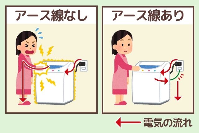アースの目的は、感電を防ぐことです。もしも電気機器が故障によって漏電しているとき、その電気機器に人が触れると電気が流れて感電してしまいます。アース線で電気機器と地面をつなげておけば、もし漏電しても電気は人よりも地面に優先的に流れていくため、感電を防げるのです。