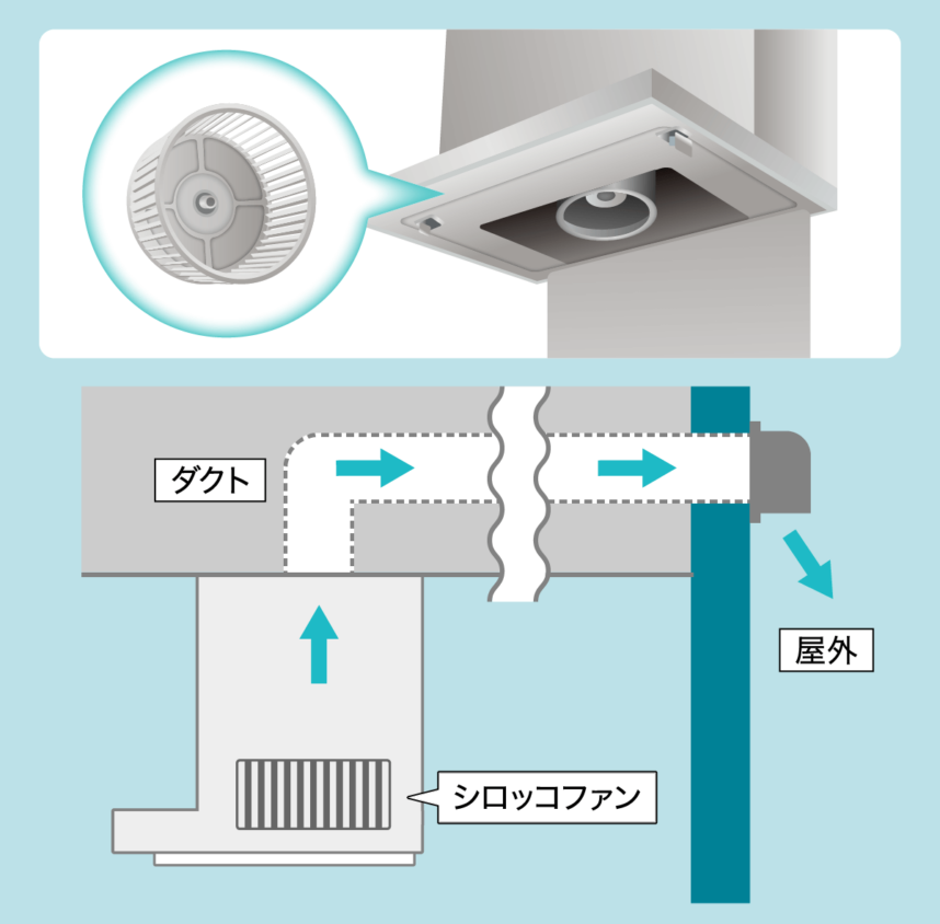 キッチンのシロッコファンはレンジフード上部の幕板というカバーでダクトホースが目隠しされているので、幕板を外して確認してみてください。