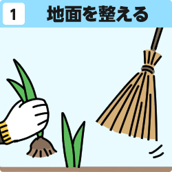 ①地面に生えている雑草を抜き、でこぼこしている場合はある程度ならし整地する