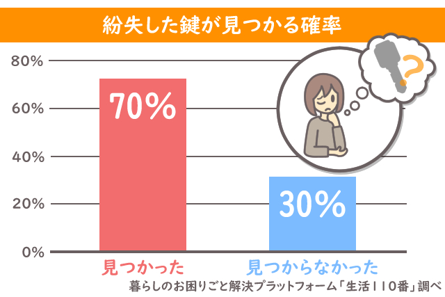 鍵を紛失して見つかる確率を調査するために、弊社がクラウドソーシングを利用して集計したアンケートでは、70%の方が紛失した鍵を見つけています。