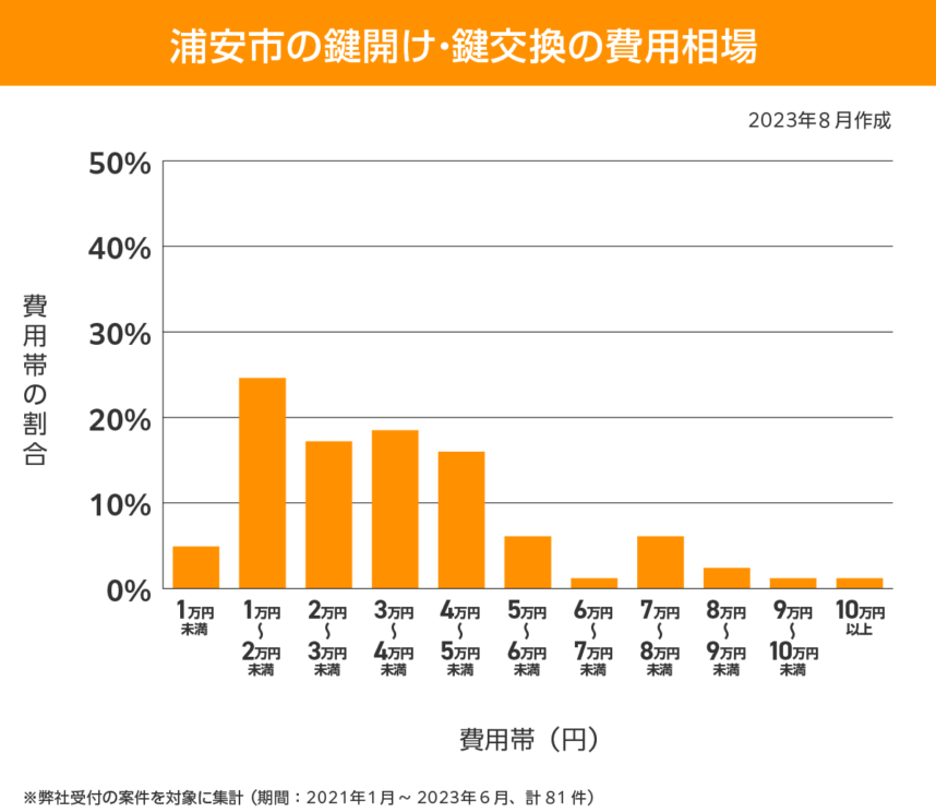 浦安市での鍵工事は、1万円~2万円代の費用帯が一番多いです。