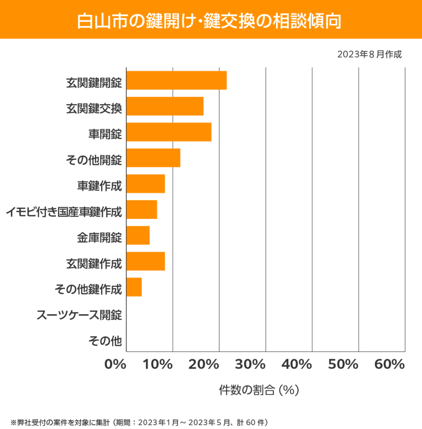 主に白山市では、依頼のほとんどが家と車の鍵のトラブルが占めています。