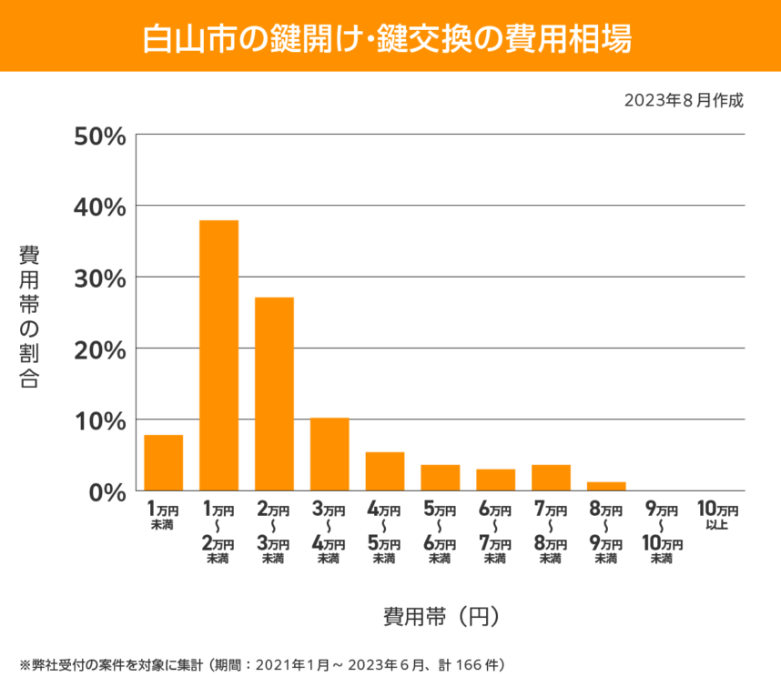 その他の価格帯ではすべて10%以下となっており、白山市での一般的な鍵開け・鍵交換は3万円未満が平均的な相場と考えておくとよいでしょう。
