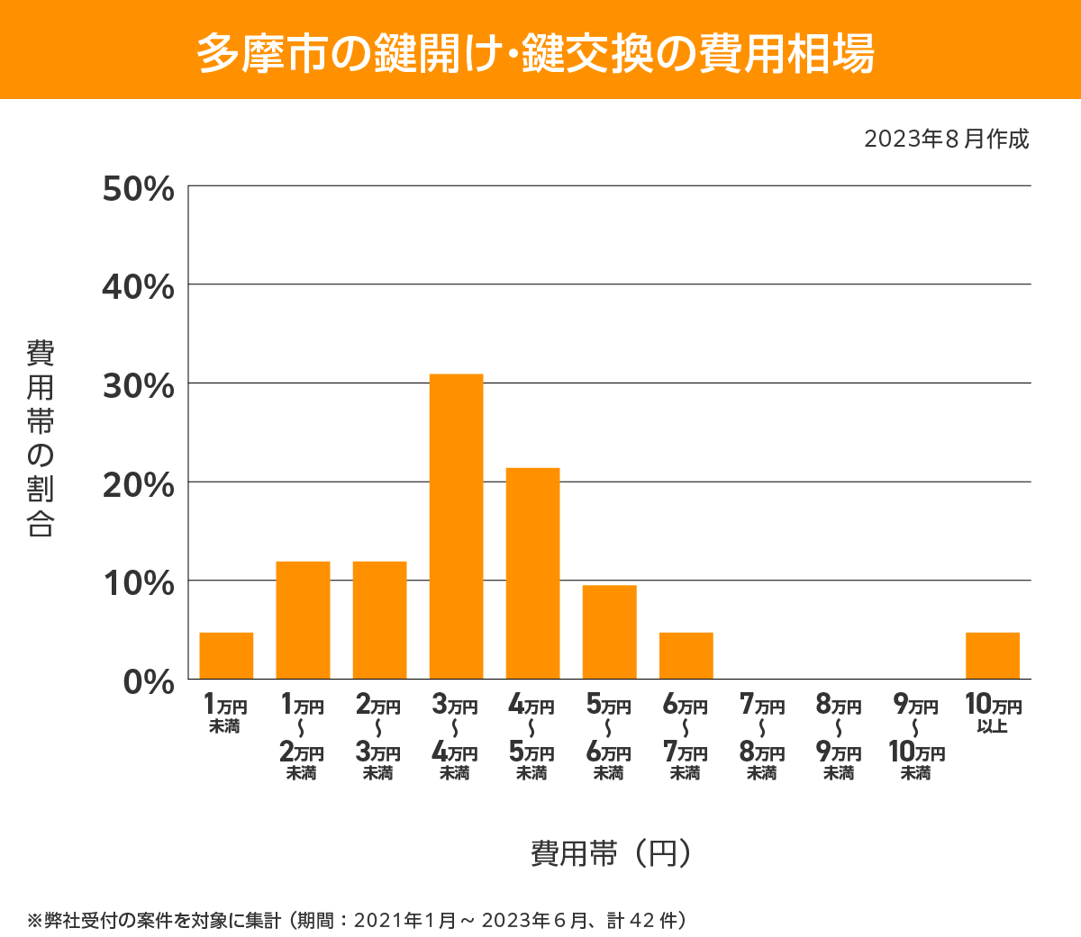 まとめるとほぼ半数が約3~5万円の費用帯に集中しており、このあたりが多摩市で鍵工事を依頼する際の相場といえるでしょう。