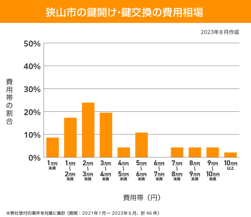 上のグラフを見てわかるように、狭山市での鍵開けや鍵交換は高くても4万円までの価格帯で収まることが多いようです。
