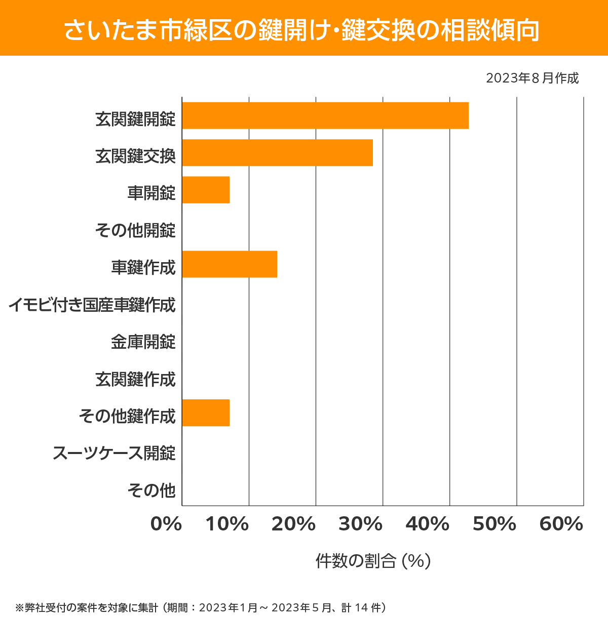| 料金目安 | 住宅関連 解錠(一般): 10,000円~ 解錠(特殊): 15,000円~ 鍵作製 :14,000円~ 車 バイク |