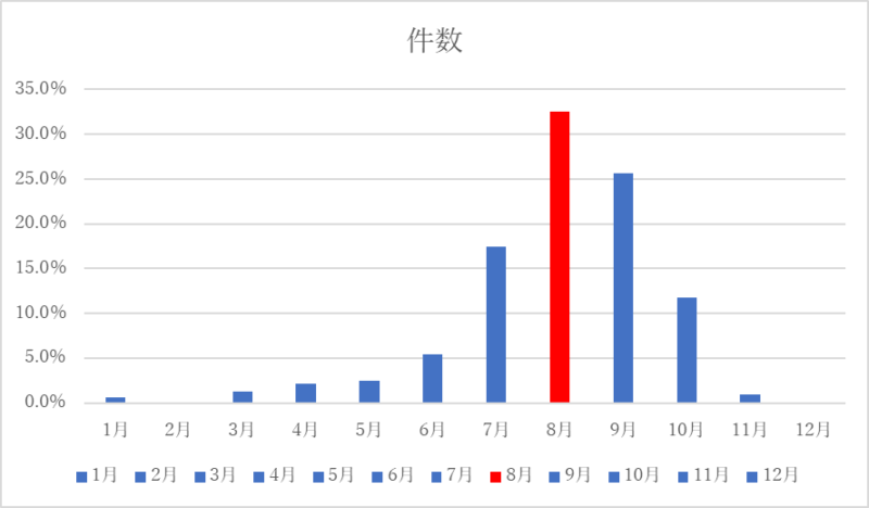 そして、とくに危険な8月。夏の暑い日には蜂がもっとも多く飛び回り、もっとも依頼件数が多くなります。9月・10月も引き続き依頼件数が多く、11月になるとほとんどの蜂が活動を停止することもあり、依頼件数は減少しているようです。