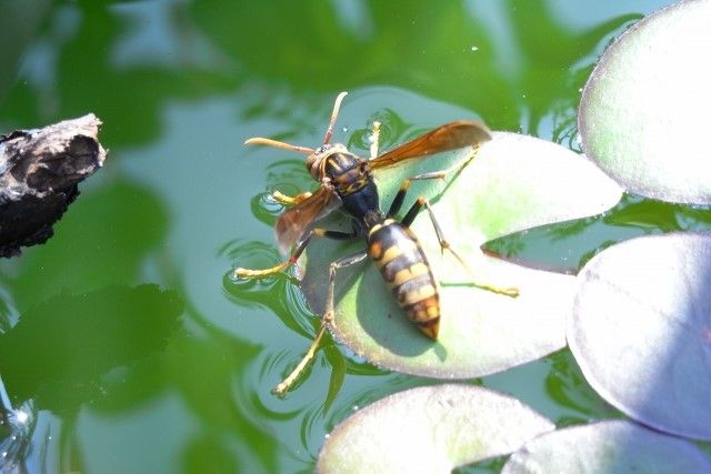 夏はアシナガバチの天敵であるヒメスズメバチなどの大型の蜂が、巣にやってくることがあります。ヒメスズメバチはアシナガバチの幼虫を食い漁り、ときには仲間を引き連れてアシナガバチの巣へ攻めてきます。