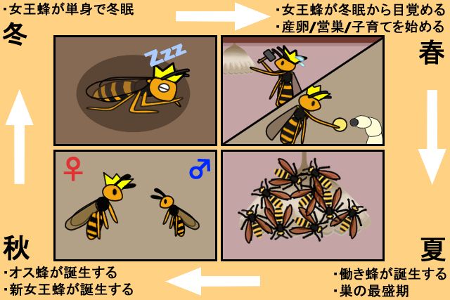 アシナガバチの生活には、季節ごとの特徴があります。ここでは、アシナガバチの一生についてご紹介します。