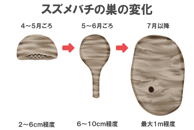 巣は春の4月ごろから作られ始め、7月ごろから急速に生長して9月ごろにもっとも大きくなります。初期の巣の大きさは5センチメートル程度です。スズメバチのなかでも最大の巣を作るキイロスズメバチの巣は、9月ごろのピーク時には直径1メートルほどに達することもあります。