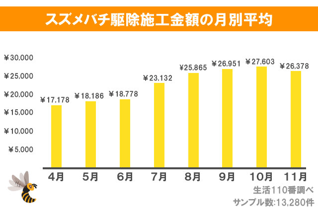 以下は実際に弊社【生活110番】の加盟店が対応したスズメバチの巣駆除料金を、月別に集計したグラフです。時期が遅くなるにつれて料金が高くなっていくのがわかります。