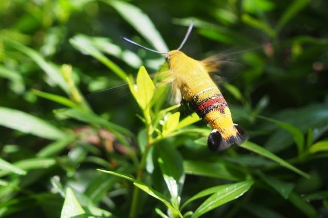 ヒメアトスカシバも蜂に近い姿をしていますが、チョウ目、スカシバガ科に分類されるチョウの仲間で蜂ではありません。山などで見かけるヘクソカズラという植物などに産卵し、幼虫はその茎の中で成長、越冬をします。