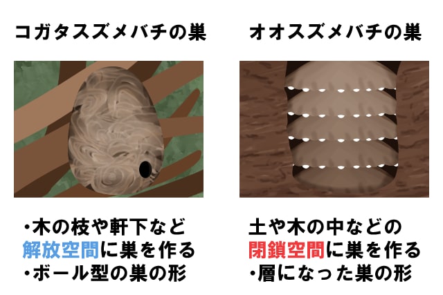 さまざまな場所に巣を作る ・地中や屋根裏など閉鎖的な空間 ・軒下や木の枝など開放的な空間 |