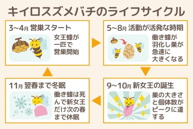 キイロスズメバチの活動は、冬眠していた女王蜂が春先に目覚めるところから始まります。最初は女王蜂が1匹で巣作りをし、最初の数十匹の働き蜂を育てます。