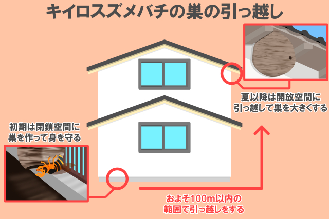 引っ越し先の巣は通常、初期の巣から100メートルほどの範囲に作られます。人家の周辺に初期の巣があった場合、引っ越しの時期である7月頃になると新たな巣作り場所を探しているキイロスズメバチが人家の中や周囲をうろつくことがよくあります。