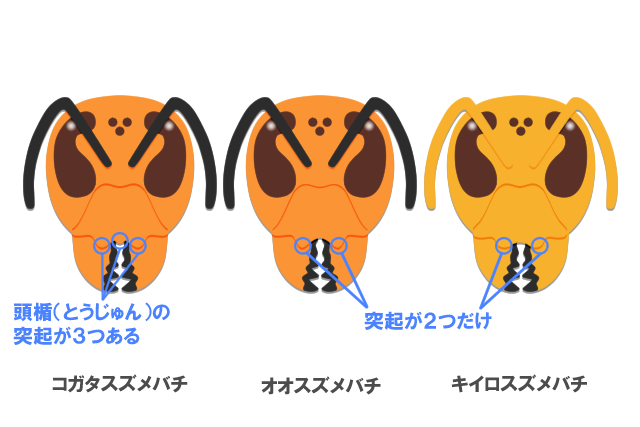 コガタスズメバチの場合は頭楯の下にある突起が3つあるので、イラストを参考に見てみましょう。