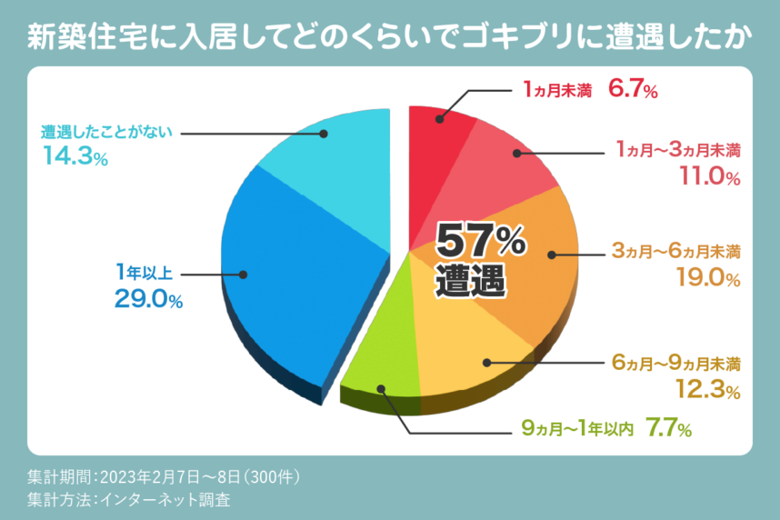 弊社が実施した、新築住宅に入居した方を対象としたアンケートの結果から、57%の方が新築住宅に入居してから1年以内にゴキブリに遭遇しています。