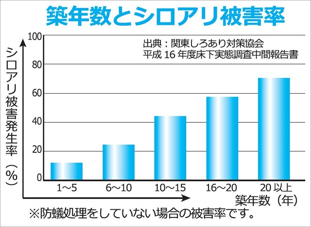 たとえば、とくに何も予防をしておらず築年数が10年経過した家は、シロアリ被害に遭う確率が約20%。