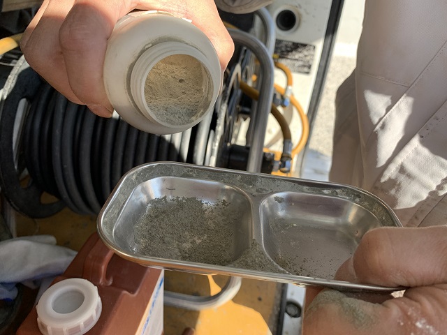 シロアリ駆除では、木材や土にしっかり浸透させる必要があるので、このようにたっぷりと垂れるぐらいの薬剤を使うのがポイントです。