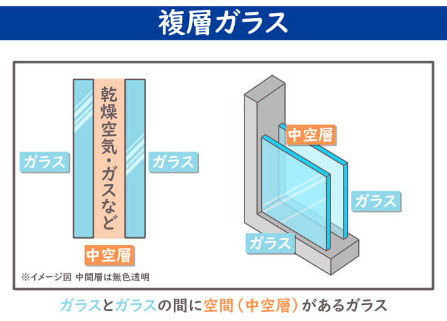 複層ガラスとは2枚のガラスを組み合わせ、ガラスとガラスの間の中空層に乾燥空気やクリプトンガスやアルゴンガスなどを封入したガラスです。