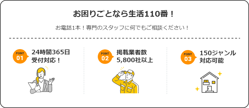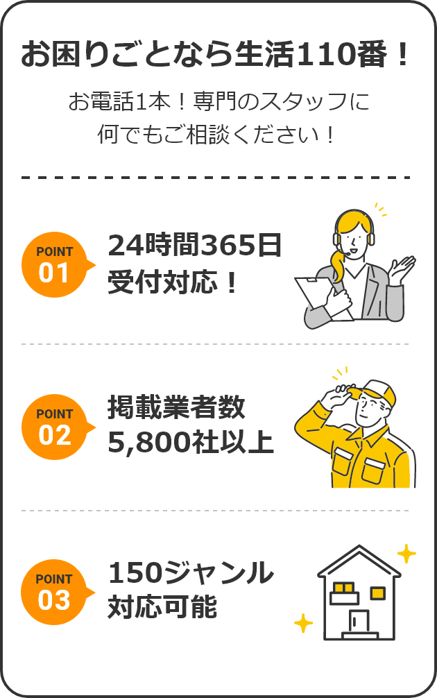 お困りごとに合わせて全国5,800社以上の中からお客様の地域で対応できる専門業者を無料でご紹介するサービスです。