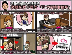 当社スタッフよりラブ探偵事務所は千葉県に創業して以来16年、全国の様々なご依頼者様から年間500件以上の調査依頼をいただき、多数の解決実績がある千葉県松戸市の探偵事務所です。 この探偵業界にも、未だ一部の悪質業者や、高額な料金を請求する業者、複雑な料金体系の業者などが多数存在しているため、世間から怪しいイメージと偏見を受けていることは事実であり、平成19年6月1日から『探偵業法(探偵業の業務の適正化に関する法律)』も制定されております。 そこで、「出会った人を笑顔にしたい」という思いから、皆様が安心して調査をご依頼できるように、一般的な探偵業者の高額な料金体系や、複雑な料金体系とは異なり、安くわかりやすい料金体系を採用しております。 また、有能な探偵調査員を輩出するため、スタッフの指導や育成にも力を注いでおり、プロフェッショナルな相談員や調査員が多数在籍しております。 私たちは、探偵業が少しでも安く身近なサービス業となれるように努力を怠らず、あなたのお役に立てる日をお待ちしております。各種調査を検討中の方は是非お問い合わせいただければ幸いです。 -