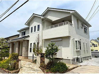 ホームページからお問い合わせ、ご依頼をいただいたお客様です。 積水ハウスの「ダインコンクリート」の塗装です。 大手ハウスメーカーの塗り替えには、一般戸建て塗装とは違い、各ハウスメーカーの特徴に合わせた専門知識が必要です。 今回もある点に注意し塗装させていただきました! 外壁の状況は、チョーキング現象が発生し、クラックがありました。 価格、塗装サイクルのバランスがいい「フッ素塗装」で仕上げました。 耐久年数が長いため、お家の寿命を長持ちさせたい人におすすめです。 こんな方におすすめ! 費用対効果の高い塗料を選びたい。 値段は抑えたいが耐久性も求めたい。 30坪 699,000円~ 35坪 769,000円~ 40坪 859,000円~ 金額は目安となります。 現地調査を行い、最適なプランをご提案致します。 フッ素樹脂塗料は各塗料メーカーが出している商品のほぼ、最高級グレードの塗料になります。 フッ素塗料人気はあるのですが、価格が高い為に使用するのはそれ程多くありません。予算があるのであれば是非とも使ってもらいたい商品になります。 機能面で言えば、殆ど全ての機能を備えたものが多く、流石フッ素樹脂塗料と言う感じです。 耐候性も高く、長期の紫外線や雨風の影響を防ぎ、防汚染性能がついているものは綺麗な塗装を維持できます。 色の変色や艶引けの面でも、他の樹脂と比べると段違いに良い性能なので、価格に恥じない性能だと思います。 それだけ価格面では一段高い価格のフッ素樹脂塗料ですが、ここ最近は値段のほうも少しづつ落ちてきていますので、以前と比べてみて使いやすくなってきたと思います。 ★長期間の美観を保持したい方 鉄部からコンクリモルタル、サイディングなどのほぼ全ての外壁に下塗りを追加することで対応しています。 短期的な使用に使うには勿体無いですが、長期間の美観を保持したい方などは是非おすすめする塗料になります。 ★トータル費用を安くしたい方 フッ素樹脂塗装は、15年以上は持つので、メンテナンスサイクルコストを抑えようと思っている方におすすめします。 ★フッ素樹脂塗料のメリット とにかく長持ち なんといっても高性能で、他の追従を寄せ付けない性能です。フッ素樹脂塗料は分子同士の結合力が他の樹脂より強い為に、紫外線などの影響を受けても壊れにくく、長期使用に耐え得る持続性を持っています。 ★最高の性能 特に溶剤型の2液型タイプは最高の性能のものが多く、1液タイプだとしてもシリコン樹脂の2液以上の性能を持っています。 フッ素樹脂塗料でも含まれてるフッ素の量は様々なので折角フッ素樹脂塗料を選ぶのならば物が良いものにしましょう。 ★高いレベルでの耐汚染性能 フッ素樹脂塗装は、超低汚染性能が付随している物も有り、通常の低汚染性能よりも高いレベルでの耐汚染性能があります。 メーカーに寄って低汚染性能も差があるのですが、超低汚染などと低汚染の上ランクで示された物などは一段と高い低汚染性能を発揮しています。 ★頻繁に塗り替え出来ない物に最適 他の塗料と比べても、艶と変色を長期にわたって守ることが出来るので、公共事業の橋や建物などでも多く採用されていたりします。 その様な塗料を住宅やアパート、マンションなどの外壁に使う事で、超長期的に建物の美観と建物自体の保護の両方を高いレベルで守ります。 ★フッ素樹脂塗料のデメリット 価格設定が高く、手が出しづらい 価格がやはり、他の樹脂塗料と比べても高いです。ここ最近はフッ素樹脂の塗料も幅広くラインナップされて来たので、安いタイプも多く出回る様になってきました。 それでもウレタンやシリコンと比べるとまだまだ高い傾向にあります。 水性のフッ素1液はそれなりに価格は安く、2液シリコン溶剤型より少し高い辺りの価格設定のものもあります。 安いと言ってもそれなりに価格のほうはしますので、良く検討してもらえたらと思います。 しかしおすすめは溶剤型の2液タイプのフッ素樹脂塗料の方が性能も価格も上なのでこちらをおすすめしたいです。 ★塗装より先にシーリングが傷むと補修が必要 建物の目地やコンクリート自体のひび割れによって折角のフッ素樹脂塗装が台無しになってしまうと、いくら塗膜がしっかりとしていても塗り替える必要が出てきてしまいます。 ヒビ割れにくい弾性系のフッ素塗料を使うなどで追従しますが、水漏れが何処か解らない場合などは再塗装になる前に、先に防水工事が必要です。 坂木塗装は北九州市・中間市を中心に職人が直接運営している塗り替え専門店です。 営業マンを置かずすべて親方職人の坂木がお客様対応や外壁塗装を行ない、徹底的に中間マージンや運営費諸経費などを削減しております。 そのような運営費や経費を掛けず、すべてをお客様の家に手を掛けたいと思っています。 外壁調査については専門知識を持った「外壁診断士」がすみずみまでチェックしどのような塗り替え・塗料が最も適しているのかなど詳