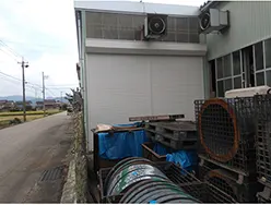 台風21号で被害を受けたとの事でした。 現状を確認すると、内側から風を受けた様子でした。 施主様にお聞きすると、後ろのシャッターが開いていたとの事でした。 シャッターは外からの風よりも内側からの風に弱いです。 スラットを横から見れば分かりますが、外側は風を逃がす形になっていますが内側は風を受ける形になっています。 建屋のシャッター、窓や扉は完全に閉めておいた方が安心です。